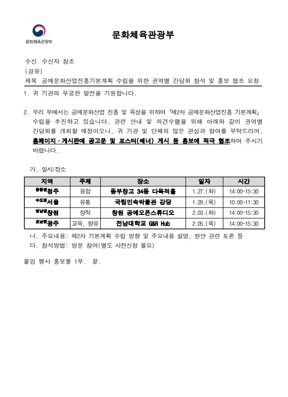 공예문화산업진흥기본계획 수립을 위한 권역별 간담회 참석 및 홍보 협조 요청..